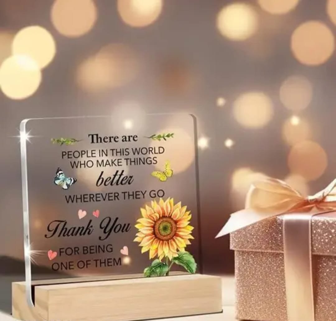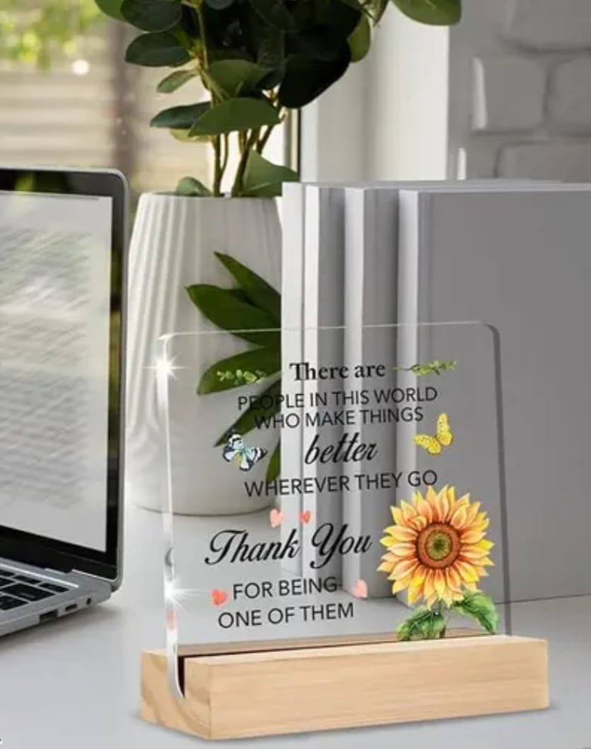 Finding the right words to say “Thank You” can be difficult, but this Sunflower Acrylic Plaque with Wooden Base says it perfectly. Designed to be more than just a gift, this plaque serves as a lasting reminder of appreciation and warmth. Whether you are looking for gifts for coworkers, a leaving gift for a colleague, or a sentimental present for a teacher or mentor, this decorative piece fits every occasion.