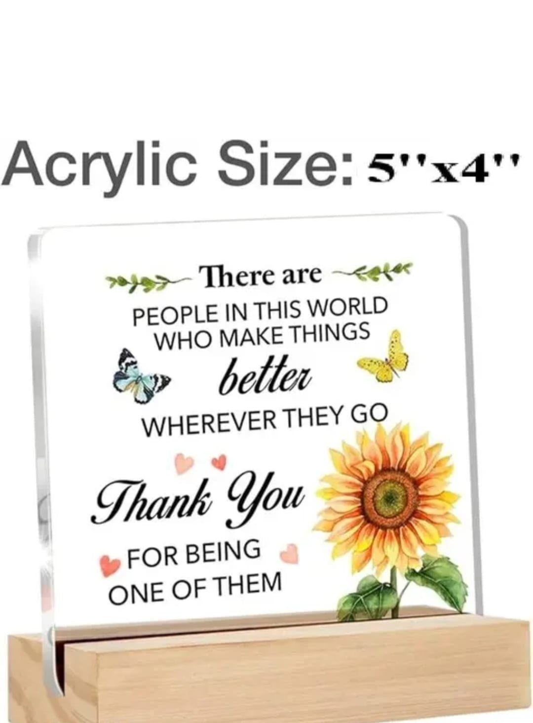 The plaque features a crystal-clear, high-quality acrylic panel printed with vibrant, fade-resistant UV ink. The design showcases a blooming yellow sunflower and delicate butterflies, symbolizing positivity, happiness, and growth. The heartwarming quote—“There are people in this world who make things better wherever they go. Thank you for being one of them”—is written in elegant typography, making it a sophisticated addition to any space.