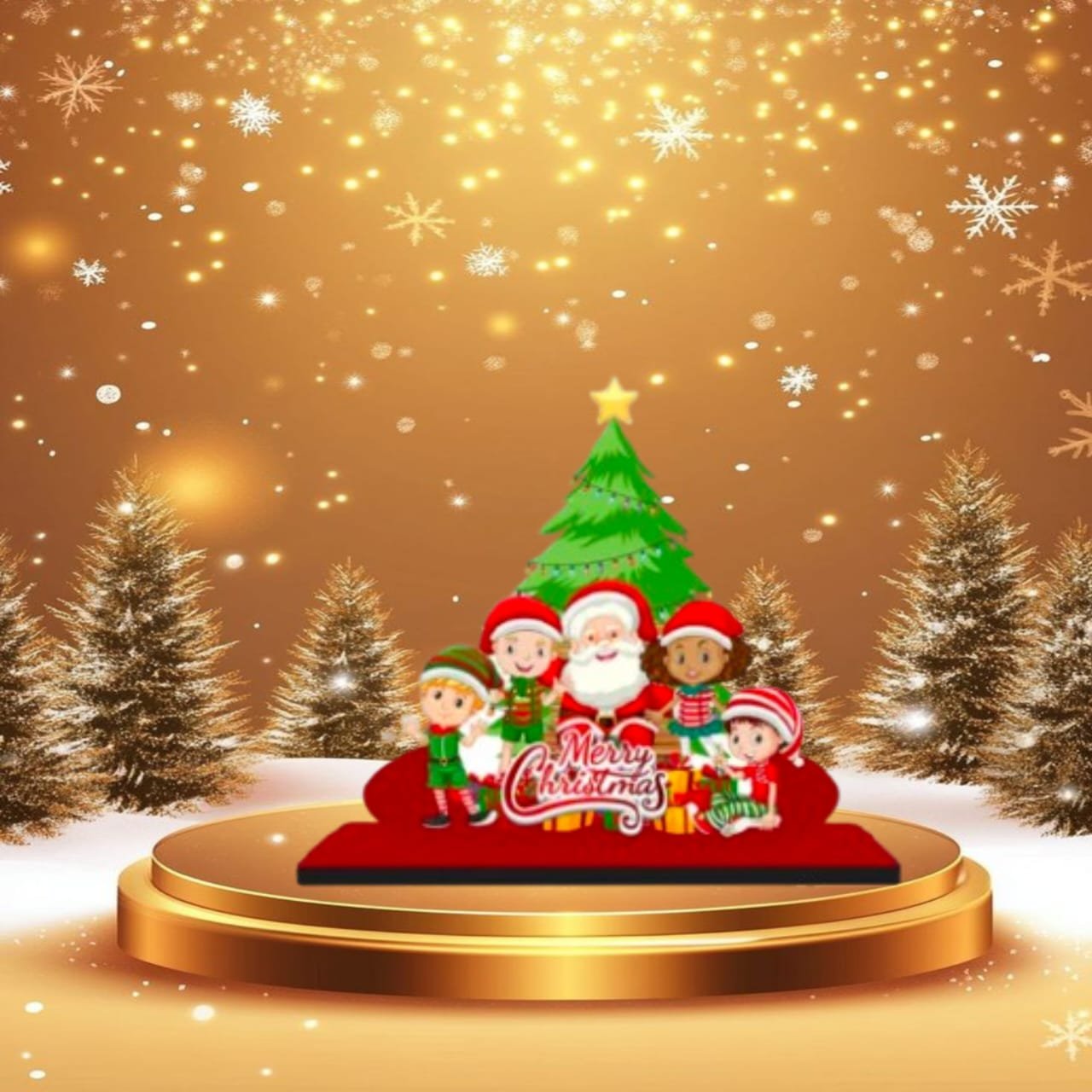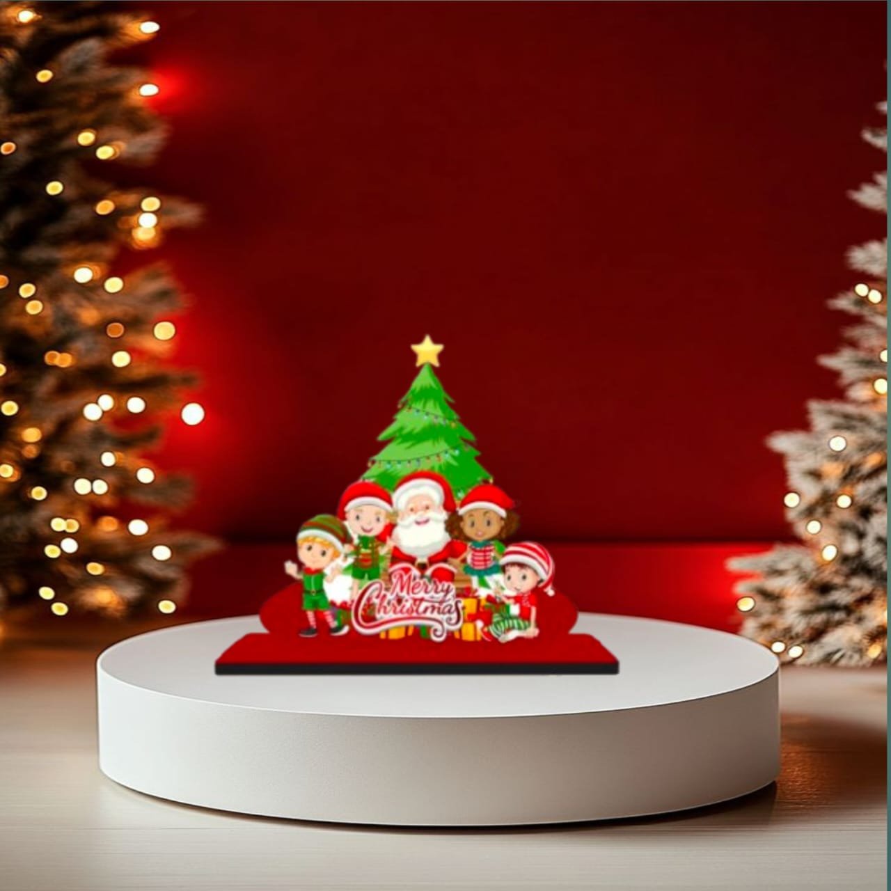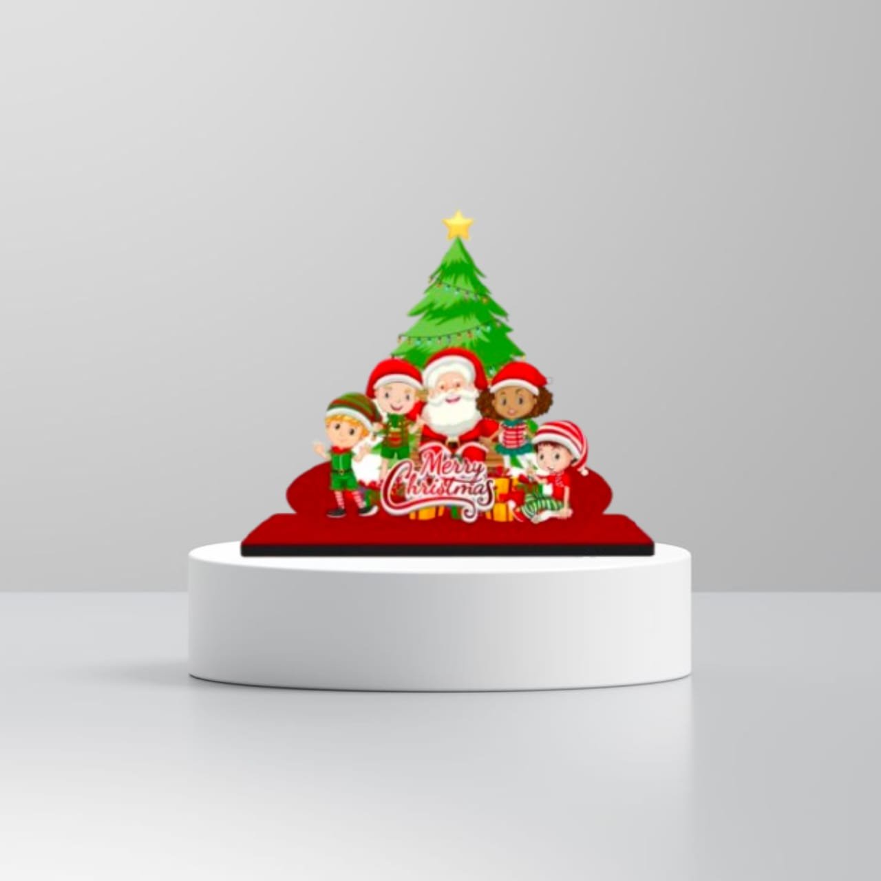 Designed with high-definition printing, this showpiece features a heartwarming scene of a smiling Santa Claus surrounded by happy elves and a decorated Christmas tree. The “Merry Christmas” typography adds a classic touch, making it a standout piece for your Christmas home decor. Unlike bulky decorations, this compact 5.5-inch standee fits perfectly on small surfaces, making it an ideal choice for apartment living, office cubicles, or study tables.
