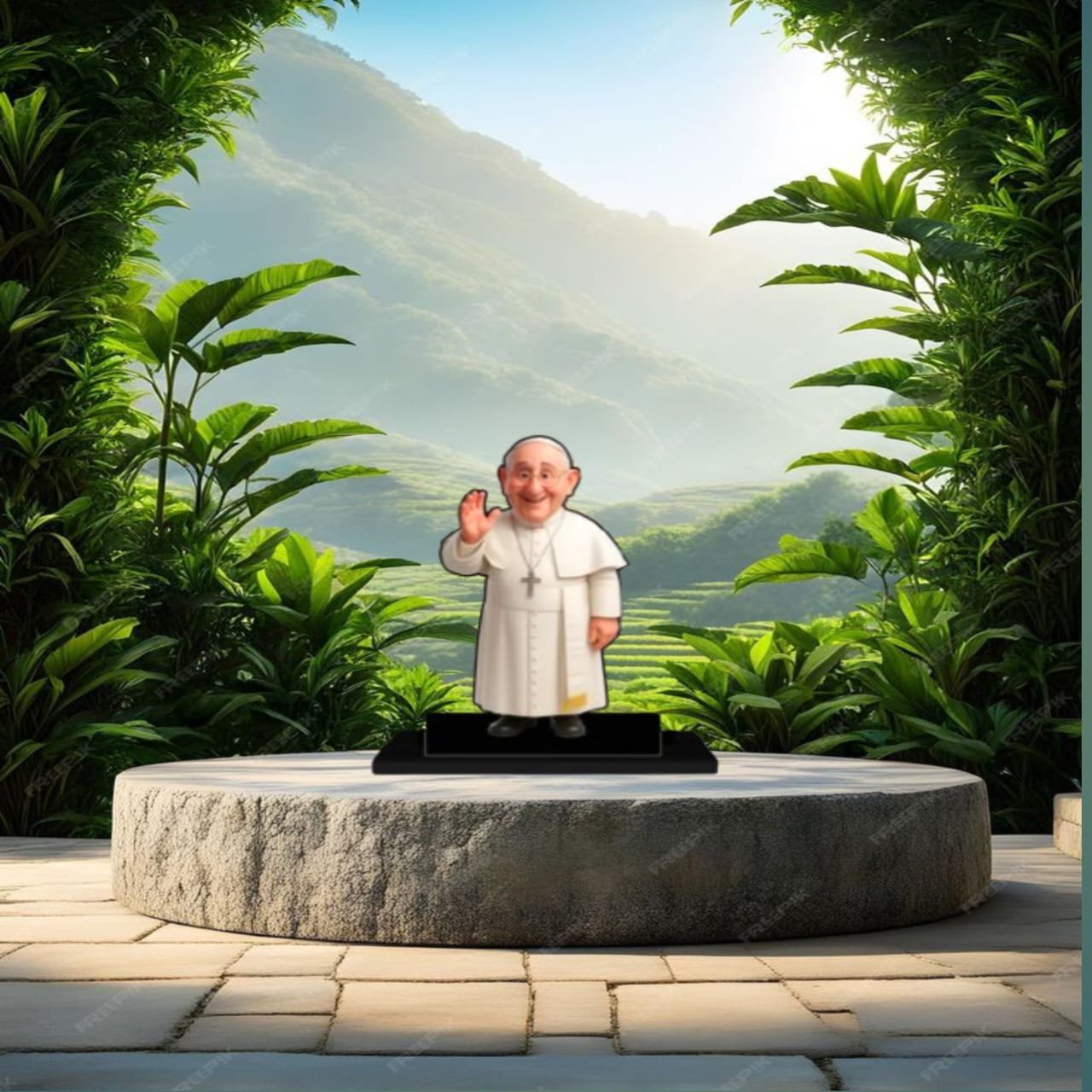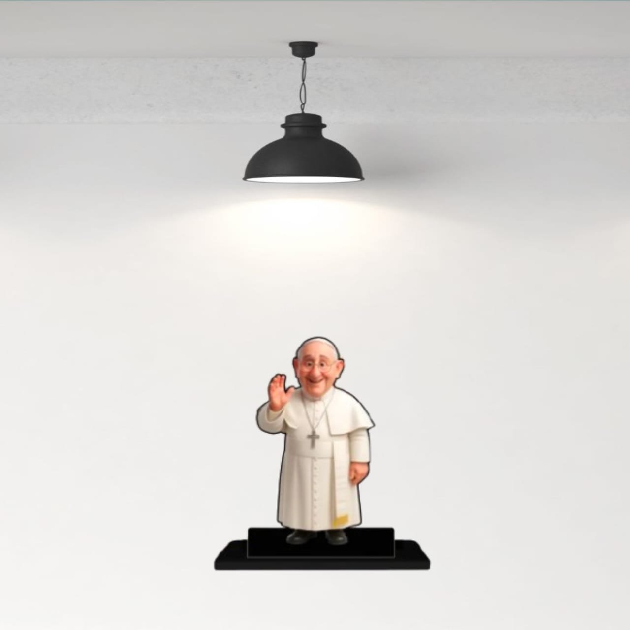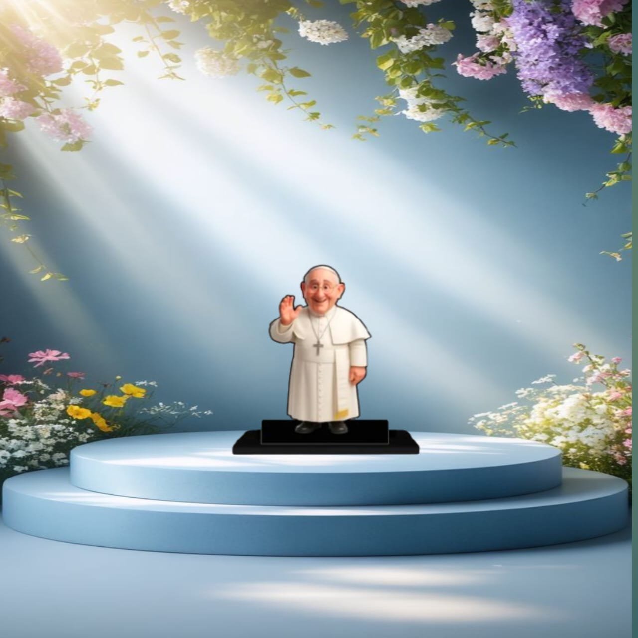 Design & Craftsmanship: Unlike heavy resin statues, this product is a modern 2D wooden cutout designed for contemporary spaces. The figure is precision-cut from durable engineered wood (MDF) and features a high-definition digital print that brings out the details of the white cassock and the pectoral cross. It stands securely on a sturdy black wooden base, ensuring it remains stable on any flat surface.