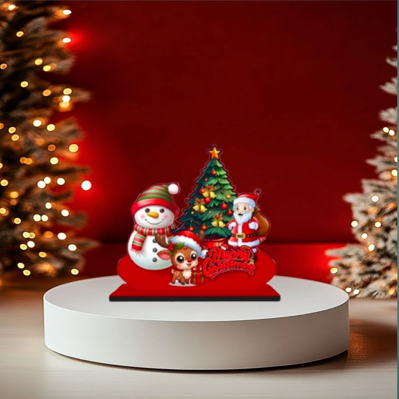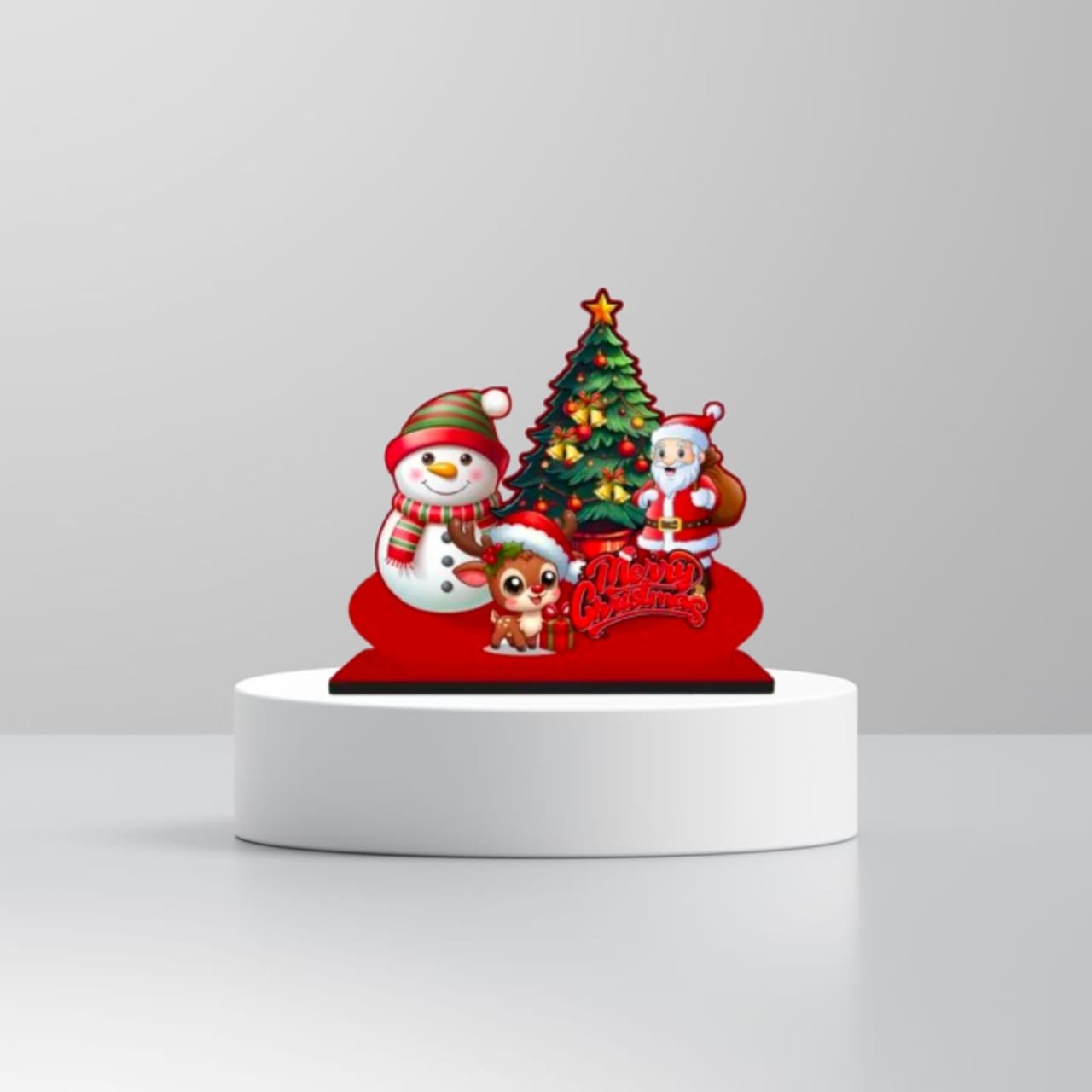 Exquisite Design & Craftsmanship At the heart of this decoration is a joyful trio that defines the holiday season: a jolly Santa Claus carrying his gift sack, a smiling Snowman wrapped in a cozy scarf, and an adorable Reindeer sitting by a decorated Christmas tree. The vibrant “Merry Christmas” typography in 3D style adds a modern touch to the traditional red base. The colors are vivid, fade-resistant, and designed to pop against any background, making it an eye-catching piece for your Christmas home decor.